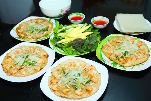 Các loại bánh đặc sản Quy Nhơn này mình gom chung vì ở nhiều nơi cũng có. Nhưng mỗi vùng miền hương vị lại khác nhau. Với bánh nướng khoai lang thì ở Quy Nhơn người ta nướng vừa lại rất thơm gừng. Bánh đậu xanh đậu đen nhân dừa thì có hình thức đặc trưng, bánh rất bùi thơm ngon mà bên trong là nhân dừa và mè rất ngon ạ.8. Bánh xèo tôm nhảy Bình Định.