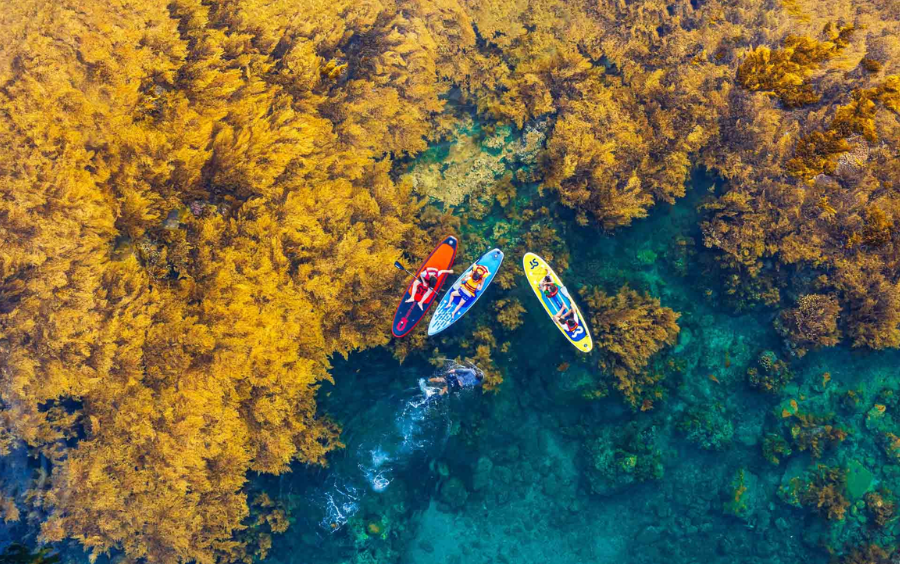 Chèo thuyền SUP: len lỏi giữa các rạn đá và thảm rong mơ mướt mát – một trải nghiệm cực “chill”.